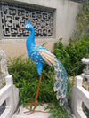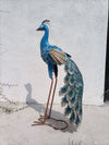 Verleihen Sie Ihrer Dekoration einen majestätischen Touch mit dieser wunderschönen, 101 cm großen Pfauenstatue. Sie ist aus handbearbeitetem und handbemaltem Metall gefertigt und besticht durch ihr detailreiches Gefieder in Blau-, Grün- und Goldtönen, die an die natürliche Anmut dieses königlichen Vogels erinnern.